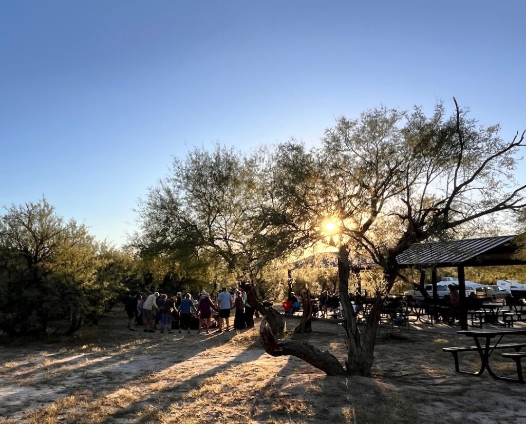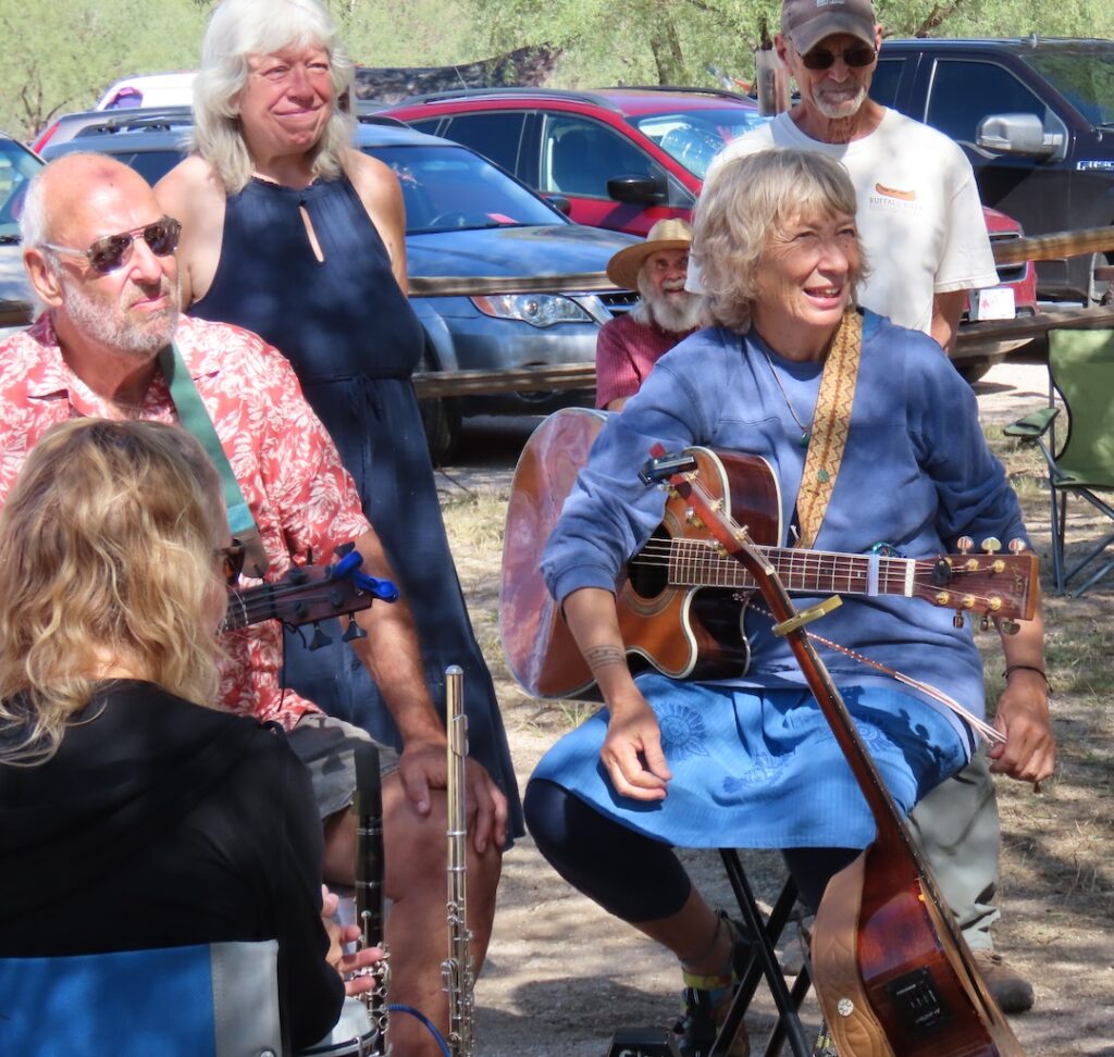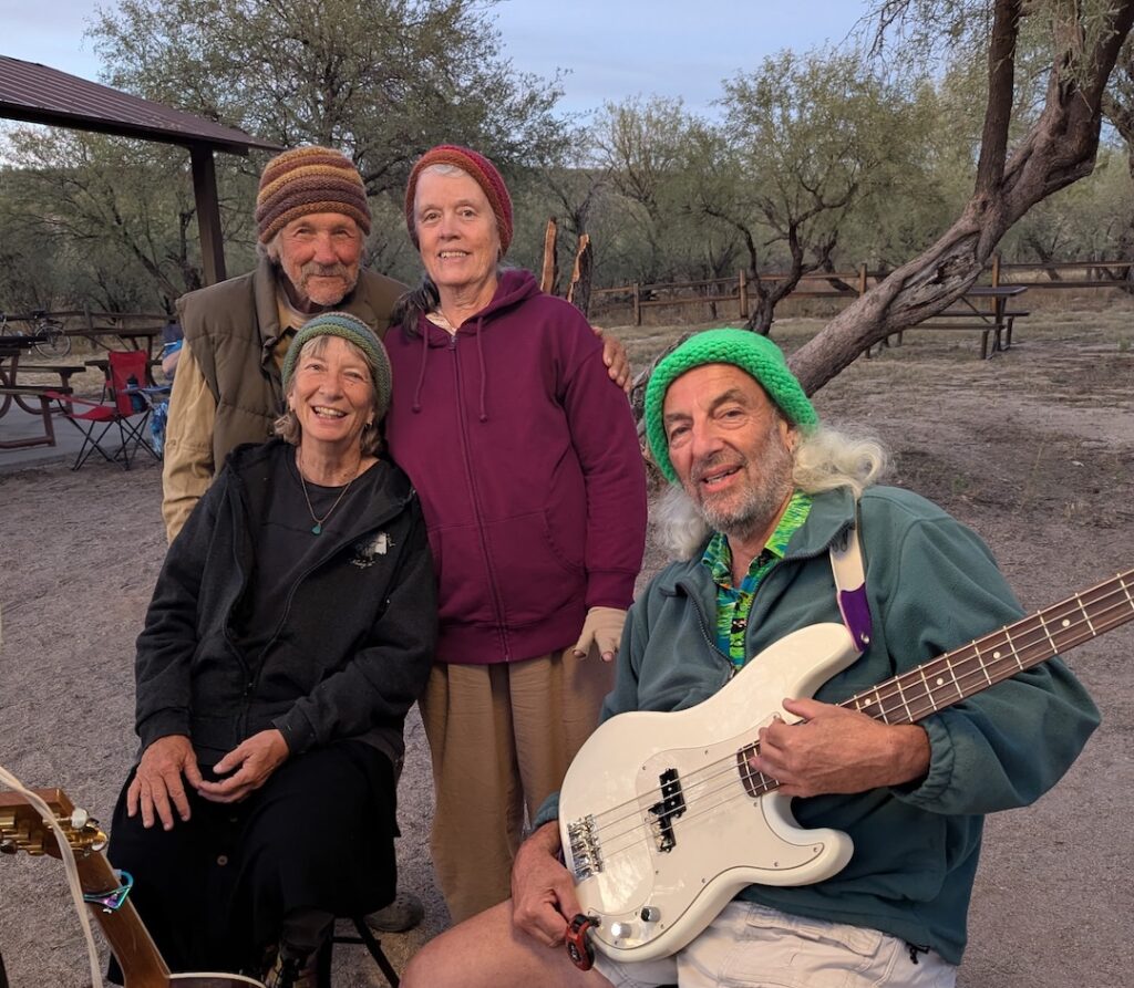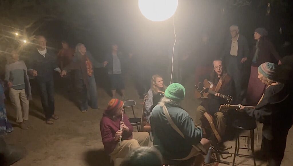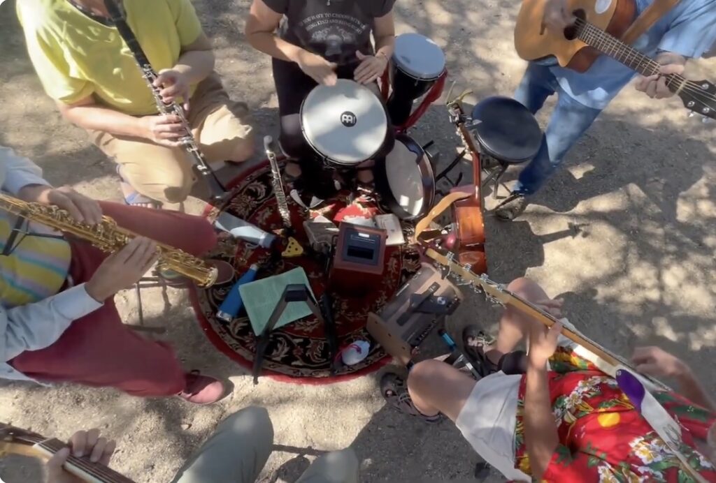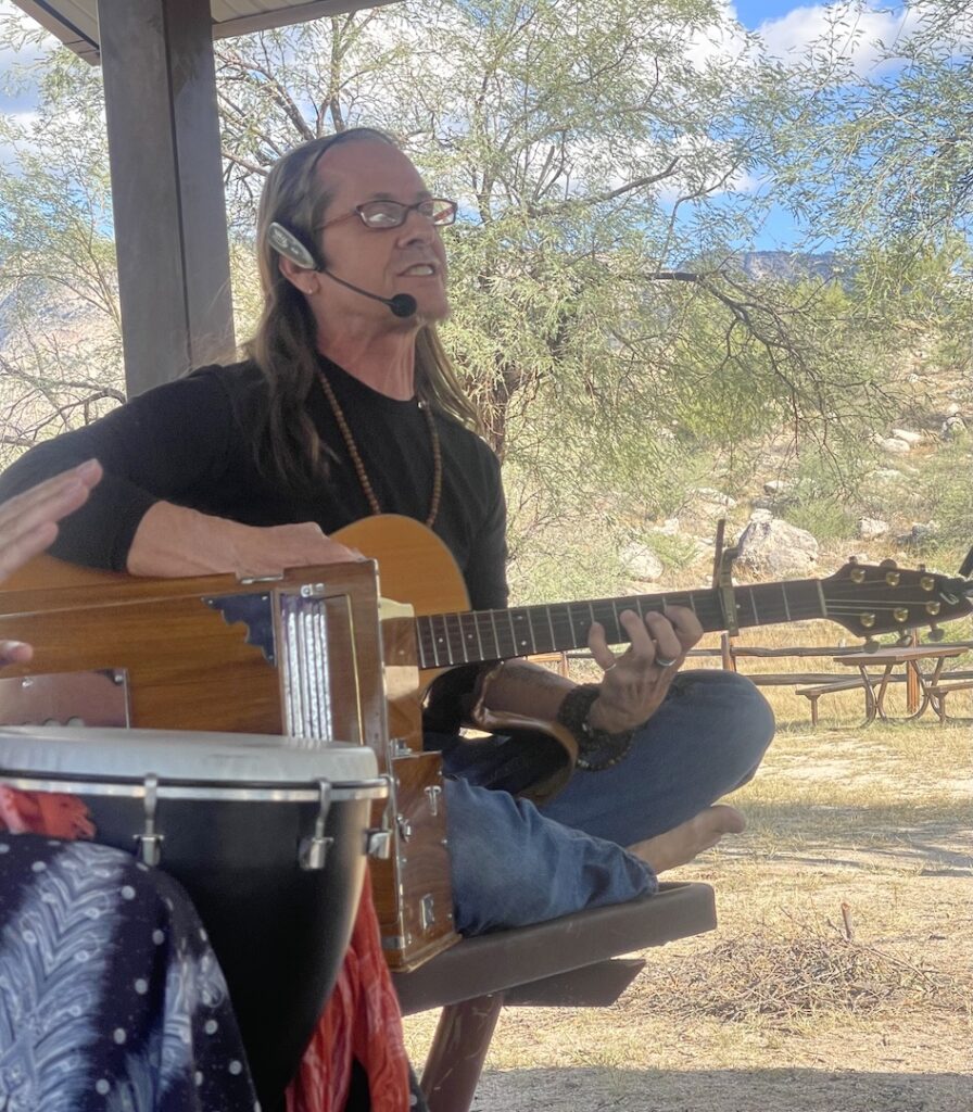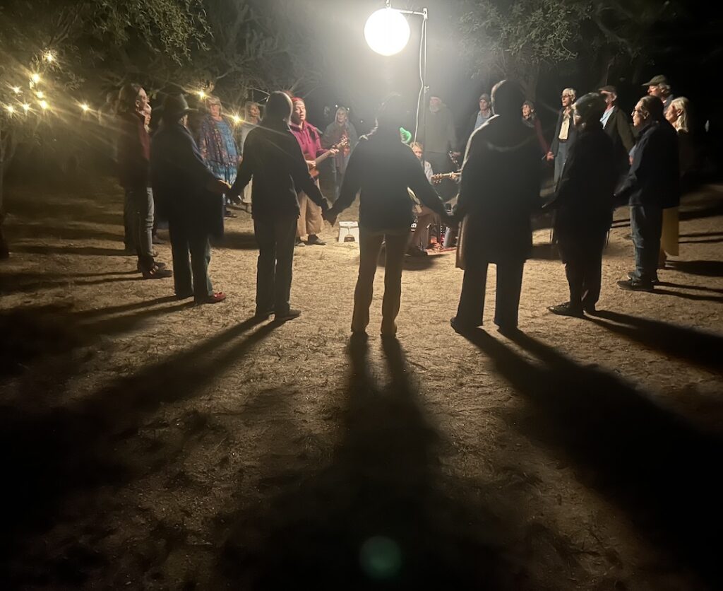 The 2025 Catalina Dance retreat was possibly the most powerful and beautiful camp ever. Leaders Sky and Shivadam, with support from Zareen, offered powerful teachings and Dances; the voices were phenomenal; kirtan, qi gong, a star party and birdwatching were also offered; the weather was perfect – and the musicians’ circle (Wayne on bass, Sky or Shivadam on guitar, Anjali on drums, Zareen on flute and clarinet, Joyus on soprano sax, with support from others at times) was amazing, collaboratively graceful, beautiful, inspired, deeply attuned, and here I run out of adjectives… You had to have been there… Thanks to photographers Dennis, Janice, Rick, Sky, Latifa, Kaya, Rahmana Elizabeth and Rick Shems.